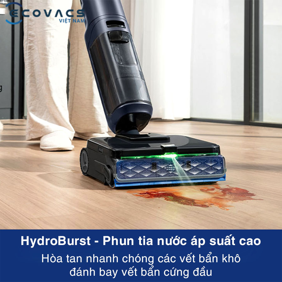 Công nghệ HydroBurst trên máy hút bụi lau nhà Tineco Floor One S7 Max Pro tạo ra tia nước áp suất cao giúp nhanh chóng làm mềm và phá vỡ cấu trúc của các vết bẩn khô, bám lâu ngày trên bề mặt sàn. Khi nước được phun tập trung đúng điểm bẩn, con lăn sẽ lập tức chà rửa và lực hút mạnh sẽ thu gom toàn bộ cặn bẩn chỉ trong một lần di chuyển.
