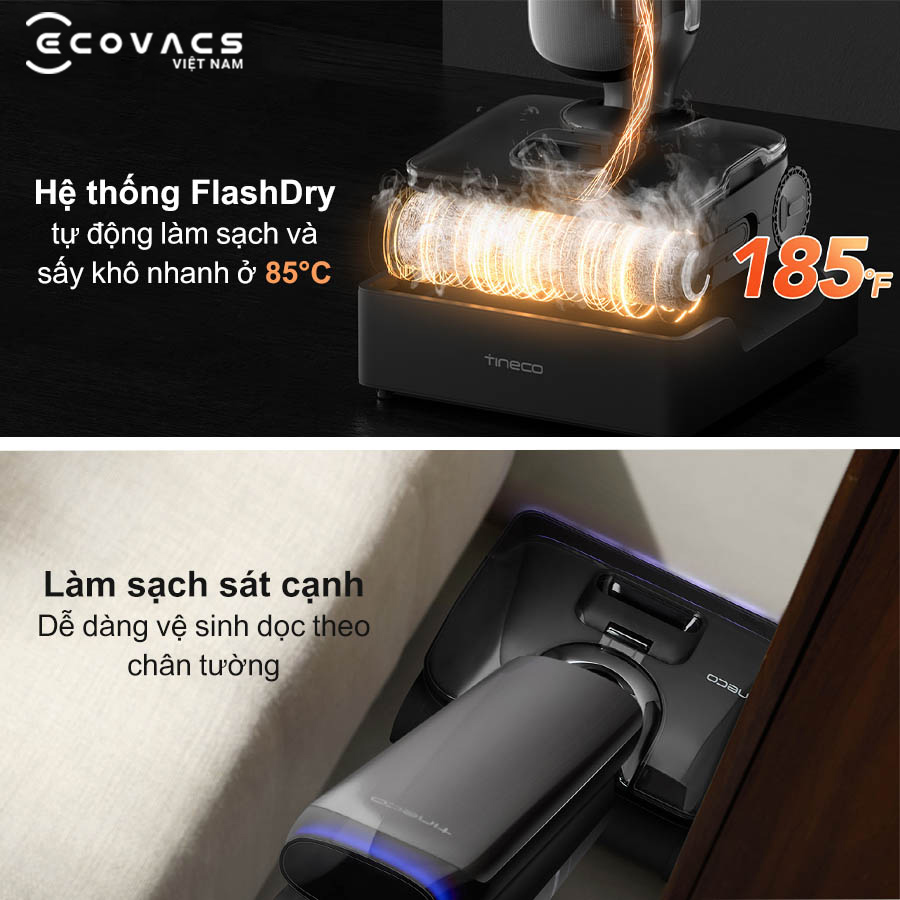 • Công nghệ FlashDry: Tự động làm sạch và sấy khô chổi lăn ở nhiệt độ 85°C trong 5 phút, ngăn ngừa vi khuẩn và nấm mốc phát triển.