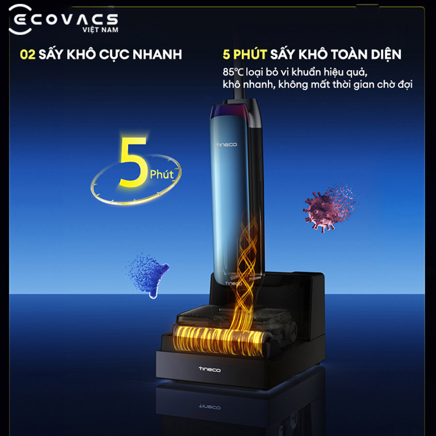 - Hệ thống FlashDry 5 phút: Sấy khô chổi lăn siêu tốc, ngăn chặn mùi hôi và nấm mốc.