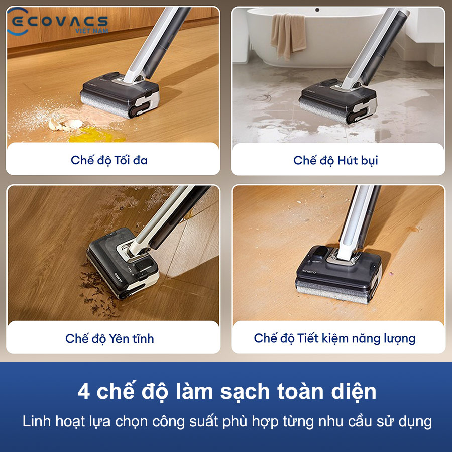 Tineco Floor One i7 Fold trang bị 4 chế độ vận hành linh hoạt, dễ chuyển đổi theo nhu cầu sử dụng. Chế độ Suction phù hợp hút nước đọng, chế độ Quiet vận hành êm ái, chế độ Max tăng lực hút cho vết bẩn nặng, và chế độ Eco tiết kiệm pin cho dọn dẹp hàng ngày. Sự đa dạng này giúp người dùng tối ưu hiệu quả làm sạch trong từng không gian và điều kiện khác nhau.