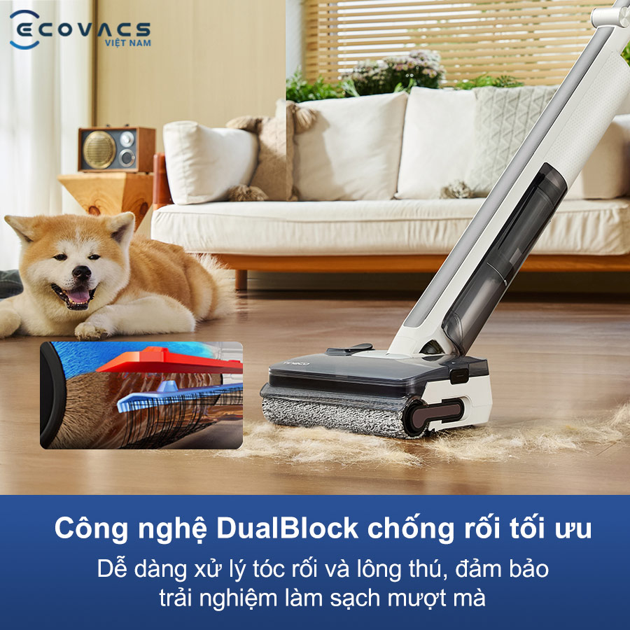 - Công nghệ DualBlock hạn chế tóc và lông thú cuốn vào chổi