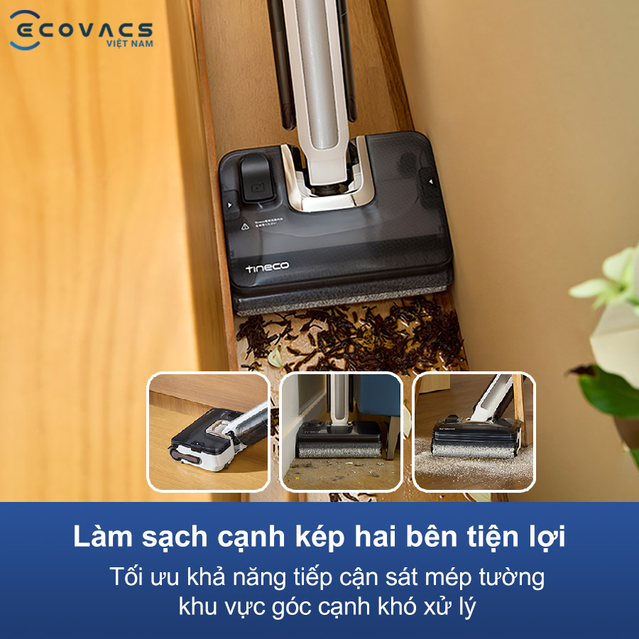 Khả năng làm sạch cạnh kép cho phép Tineco Floor One i7 Fold tiếp cận sát chân tường, mép sofa và các góc hẹp trong nhà. Thiết kế con lăn tiếp xúc hai bên giúp thu gom bụi bẩn ở những khu vực thường bị bỏ sót khi lau thủ công. Nhờ đó, sàn nhà được làm sạch đồng đều từ trung tâm đến rìa phòng, mang lại hiệu quả vệ sinh toàn diện hơn.