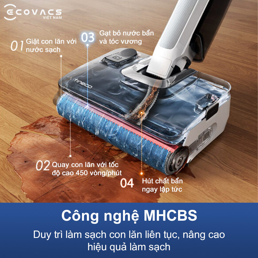 Tineco Floor One i7 Fold tích hợp hệ thống MHCBS giúp con lăn được làm sạch liên tục trong khi máy hoạt động. Nước sạch được cấp liên tục, con lăn quay tốc độ cao để đánh bật vết bẩn, sau đó nước thải và chất bẩn được hút ngay vào bình chứa. Cơ chế đa bước này ngăn nước bẩn quay lại sàn, đảm bảo bề mặt luôn được lau bằng nước sạch và duy trì hiệu suất ổn định.