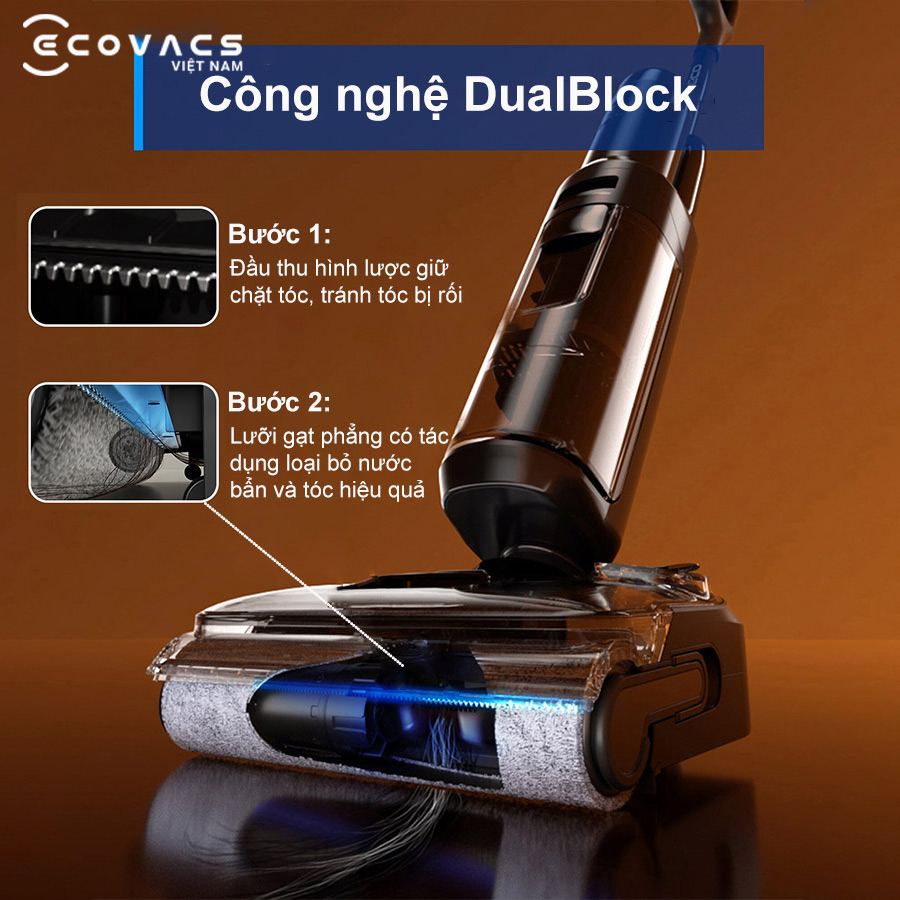 Hệ thống gồm hai lưỡi gạt hoạt động liên hoàn, trong đó lưỡi phía trước ngăn tóc cuốn vào trục chổi ngay từ đầu, còn lưỡi phía sau có nhiệm vụ cạo sạch tóc, nước bẩn và cặn bám còn sót lại. Cơ chế này giúp chổi lăn luôn thông thoáng, duy trì lực hút ổn định và giảm đáng kể thời gian vệ sinh thủ công sau mỗi lần sử dụng.