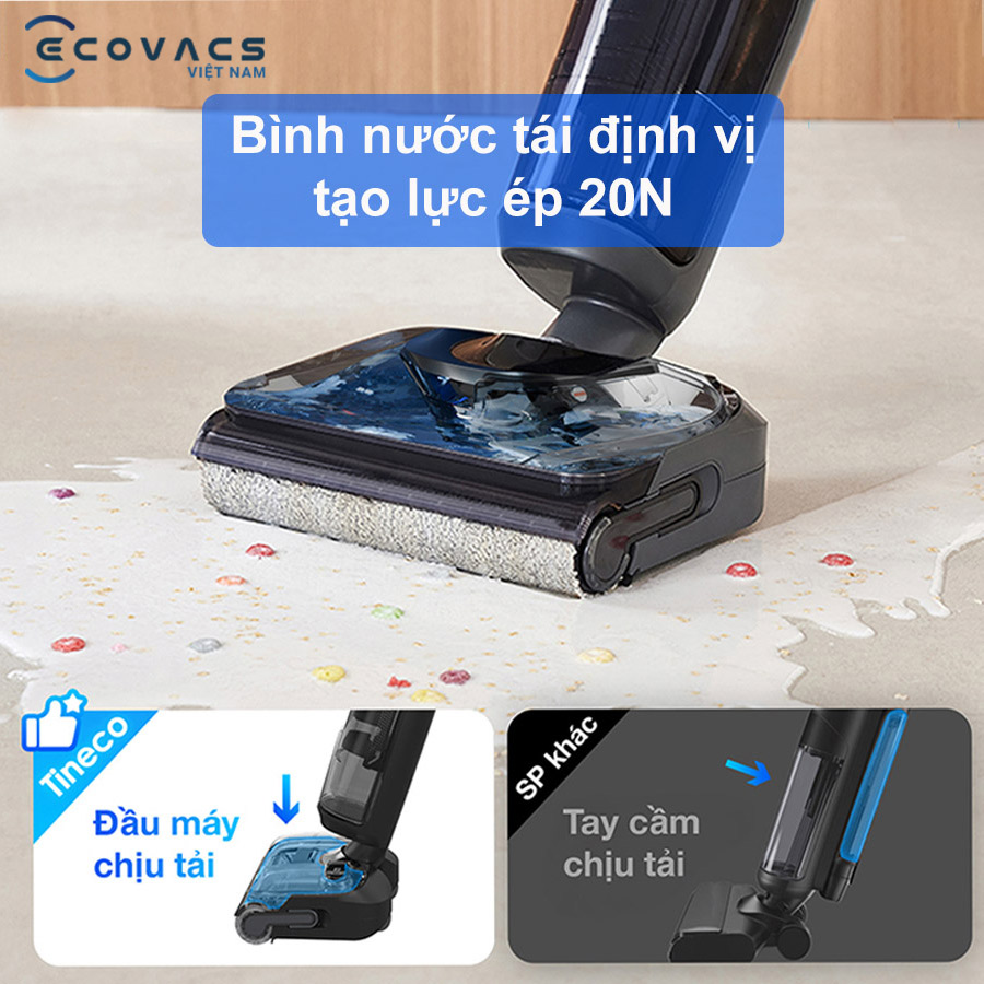 Một trong những cải tiến đáng chú ý trên máy hút bụi lau sàn Tineco Floor One S6 Stretch Extreme là thiết kế bình nước sạch được tái định vị nhằm tạo thêm lực ép trực tiếp xuống mặt sàn. Cấu trúc này giúp tăng thêm khoảng 20N áp lực trong quá trình lau, hỗ trợ đánh bật các vết bẩn bám lâu ngày mà không cần người dùng phải dùng lực tay.