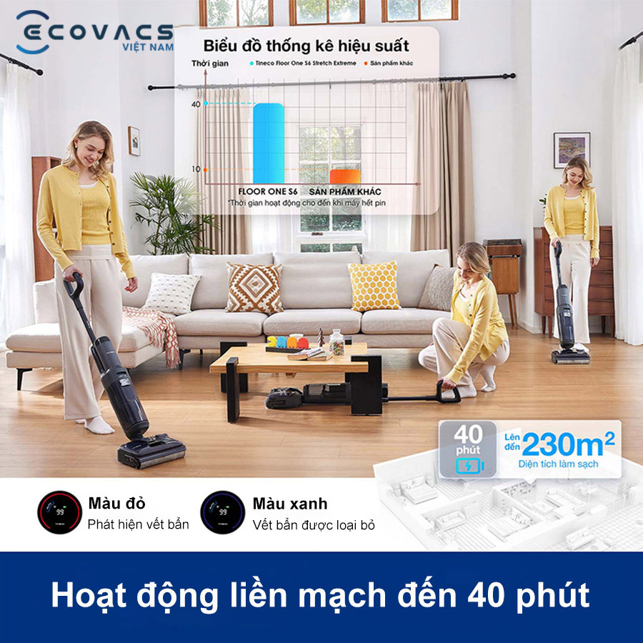 Việc kết hợp hút bụi và lau sàn trong cùng một thao tác giúp rút ngắn đáng kể thời gian dọn dẹp hằng ngày, đồng thời hạn chế tình trạng bụi bẩn bị kéo lê trên sàn. Kết quả là bề mặt sàn luôn sạch sâu, khô thoáng và đồng đều chỉ sau một lần vận hành với Tineco Floor One S6 Stretch Extreme.