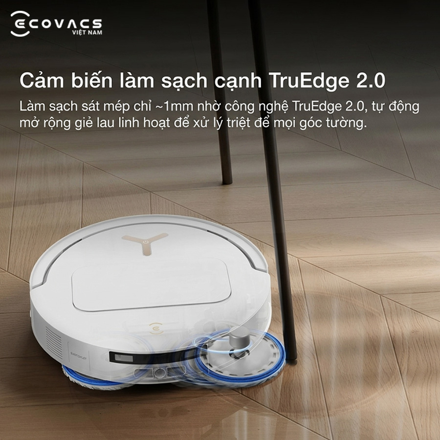 Những vị trí như mép tường, chân tủ hay góc nội thất thường là nơi dễ bám bụi nhưng lại khó được làm sạch triệt để. Với công nghệ TruEdge 2.0, robot hút bụi lau nhà Ecovacs Deebot T50S Pro Omni có thể tiếp cận sát mép với khoảng cách chỉ khoảng 1mm, giúp tăng độ phủ làm sạch và hạn chế đáng kể tình trạng bụi bẩn còn sót lại dọc theo viền sàn.