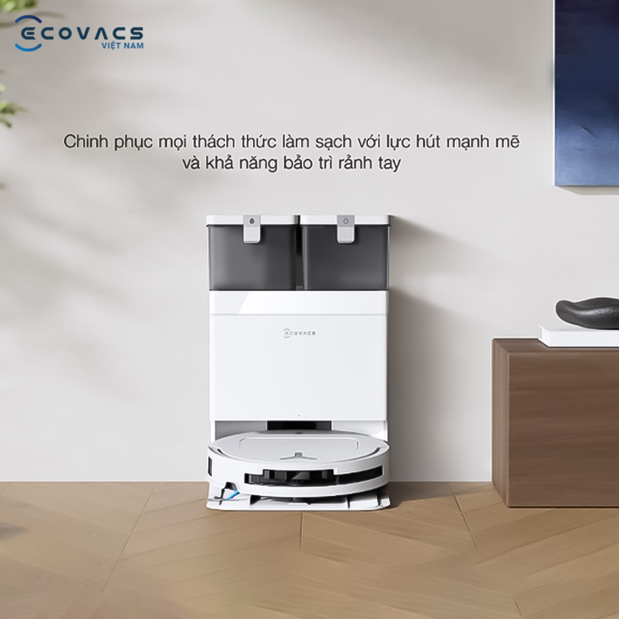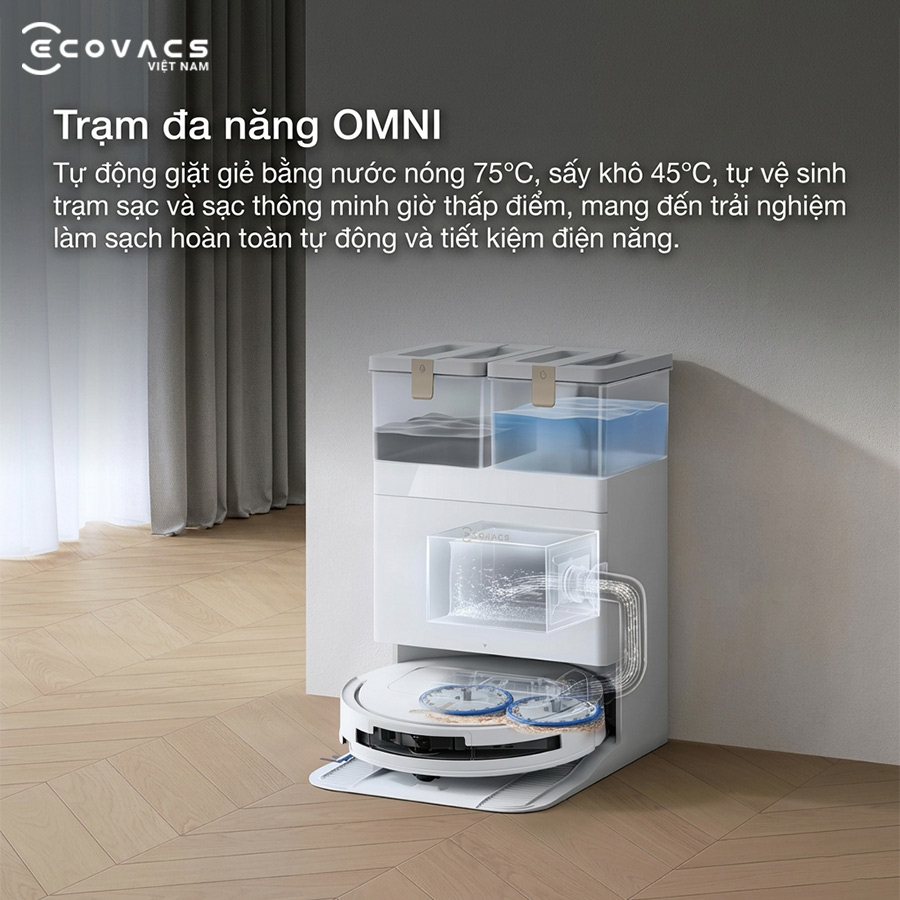 - Trạm OMNI tự động: Giặt giẻ nước nóng 75°C, sấy khô 45°C và tự động đổ rác, giảm thao tác vệ sinh thủ công.