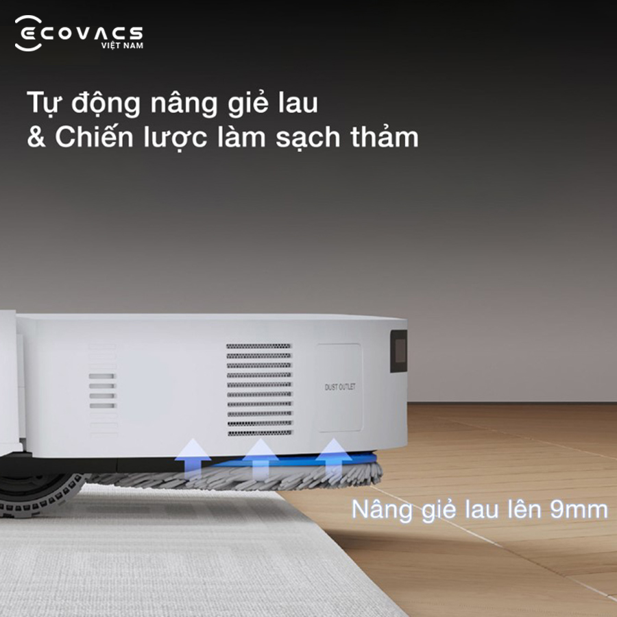 Khi di chuyển từ sàn cứng sang khu vực có thảm, robot hút bụi lau nhà Ecovacs Deebot T50S Pro Omni có thể nhận diện nhanh chóng nhờ cảm biến siêu âm độ chính xác cao. Hệ thống sẽ tự động nâng giẻ lau lên 9mm, giúp tránh làm ướt bề mặt thảm và bảo vệ chất liệu sợi vải trong quá trình vệ sinh.