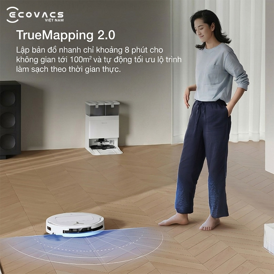 Với công nghệ TrueMapping 2.0, robot hút bụi lau nhà Ecovacs Deebot T50S Pro Omni có thể hoàn thành bản đồ không gian 100m² chỉ trong khoảng 8 phút, giúp rút ngắn đáng kể thời gian thiết lập ban đầu khi mới sử dụng thiết bị.